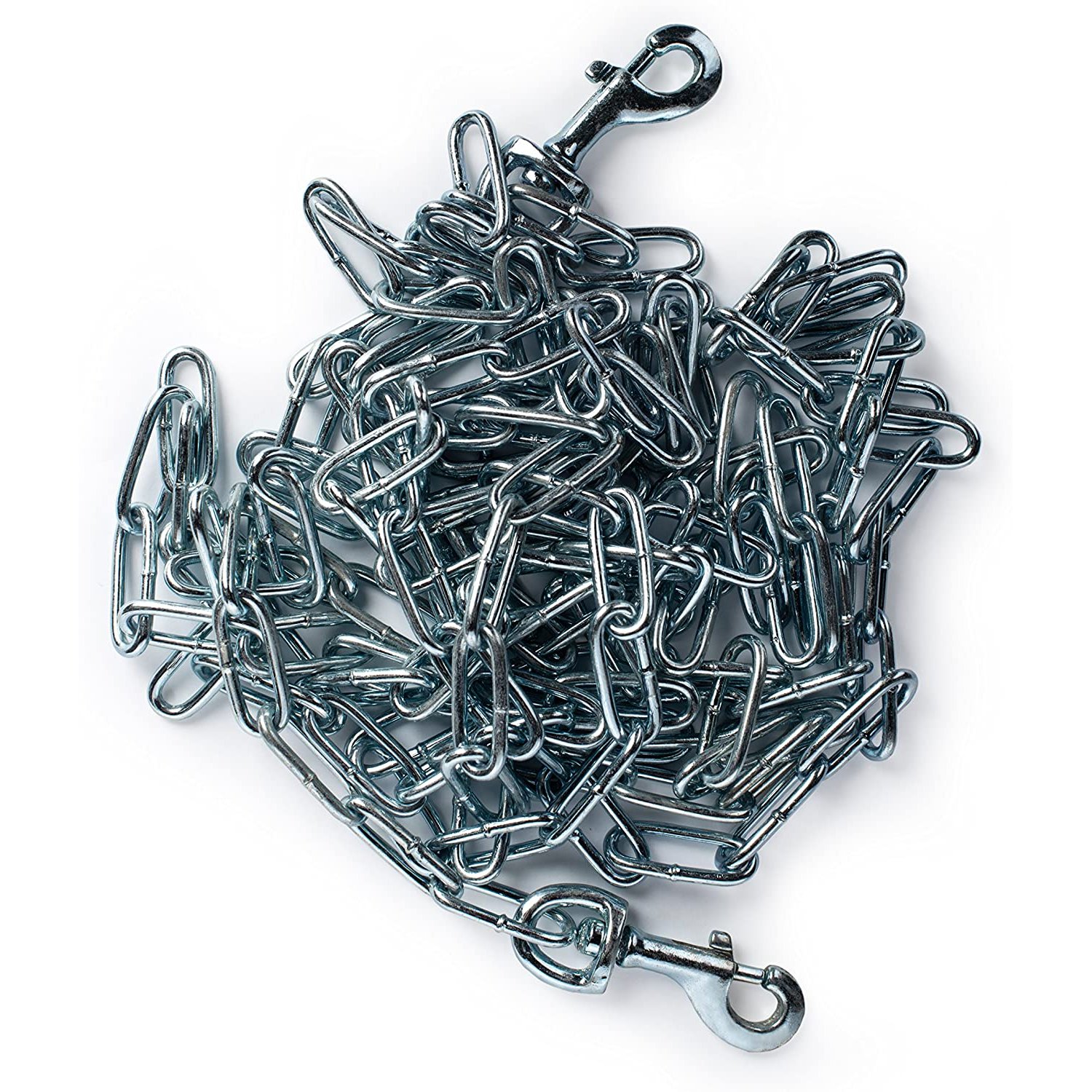 Prevue Pet Products heavy-duty 15Æ tie-out chain 2116 is designed for dogs up to 150 lbs. Zinc plated welded oval links are strong, ensuring your dog stays safe and secure. Premium quality die-cast iron swivel bolt snaps at both ends connect easily and prevent tangling. Heavy duty tie out chain is 15 foot long and 3.8 mm in diameter.